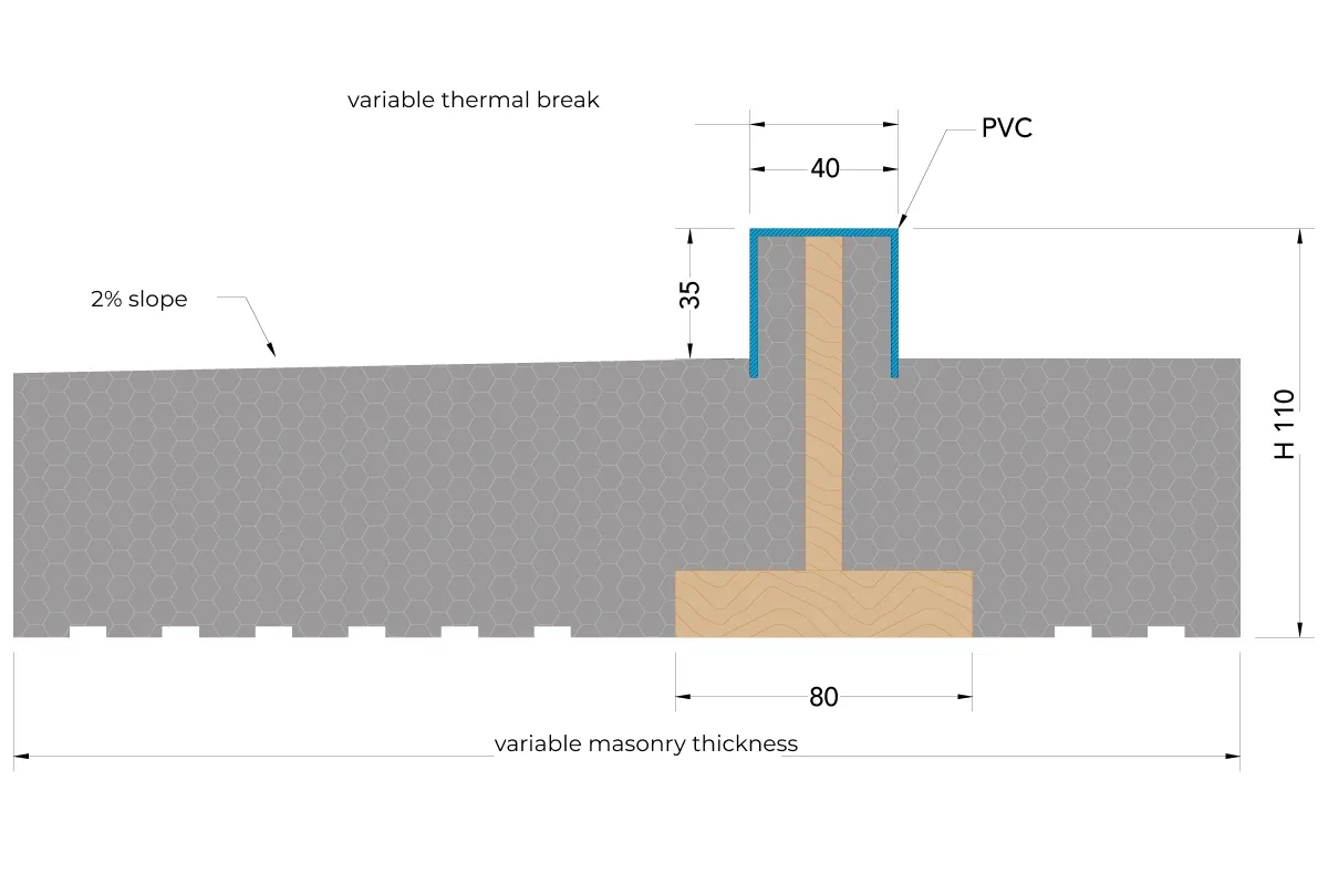 A 80 mm sub-sill made of wood, expanded polystyrene (EPS), and PVC, flush with the interior wall. Designed to accommodate a centrally mounted window frame.