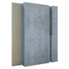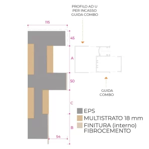 A 115 mm thermal jamb constructed with wood and expanded polystyrene (EPS) on three sides, flush with the interior wall. It includes a “U”-shaped profile designed for a combination guide. Interior finished in fiber cement. Exterior to be plastered.