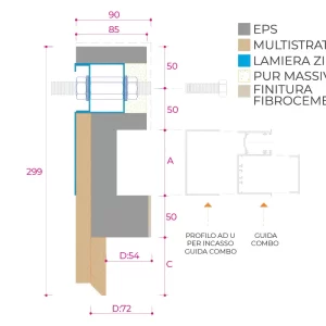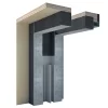 A 90 mm thermal jamb constructed with double-layered wood and expanded polystyrene (EPS) on three sides. Designed for parapet fixation, it includes a “U”-shaped profile prepared for a combination guide and a recessed insect screen guide. The window frame is centrally mounted within the wall. The interior surface is finished with fibre cement, while the exterior surfaces on all three sides are prepared for plastering.