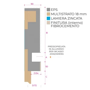 A 90 mm thermal jamb constructed with double-layered wood and expanded polystyrene (EPS) on three sides, featuring a 250 mm wooden block for hinge anchoring. Designed to accommodate a recessed insect screen. The interior surface is finished with fibre cement, while the exterior surface is prepared for plastering.