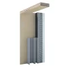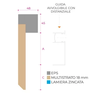 A 48 mm thermal jamb constructed with expanded polystyrene (EPS) and wood, designed to accommodate a roller shutter guide with spacer. The third side features EPS with a snap closure.