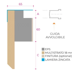 A 65 mm thermal jamb made of steel, wood, and EPS on three sides, designed for renovation projects. It is prepared exclusively for housing a roller shutter guide, with the window frame installed centrally within the wall. The interior surface and the third side are ready for plastering.